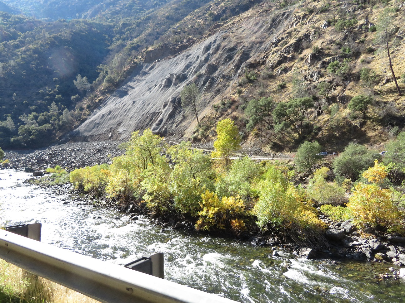 In this picture you can see the road on the opposite side of the river was overcome with rocks, so they had to close that portion and move the road across the river temporarily: