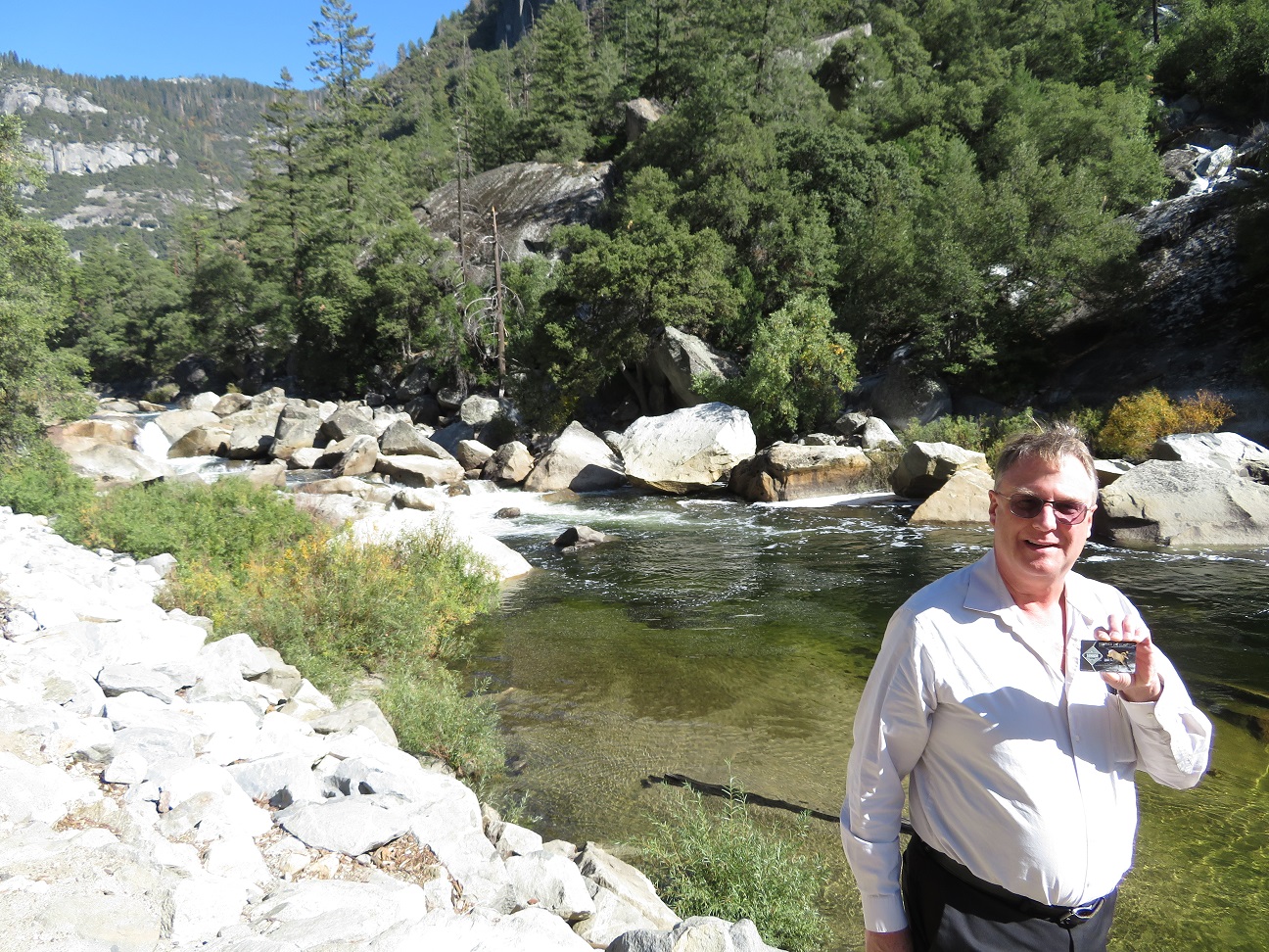 When we entered the Yosemite National Park, the entrance fee was $40 per vehicle, or $80 for a year long pass to all the parks. But the senior fee if you're 62 or over was $20 for a year long pass to all the National Parks, or $80 for a lifetime pass to all the National Parks. I'm 63, so for the first time ever I used a senior discount and bought a lifetime pass to all the National Parks. I'm not sure how I feel about that. Hmmm. Here I am just after we entered the park with my new lifetime pass: