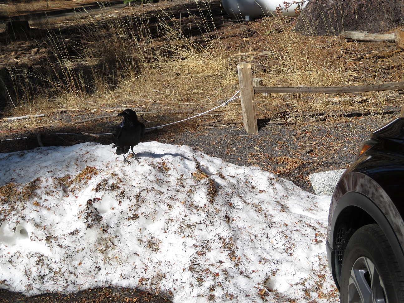 We drove up to the trail to the Tuolumne Grove of Sequoias. There was a pile of snow in front of the car where we parked, and a large bird asking for food: