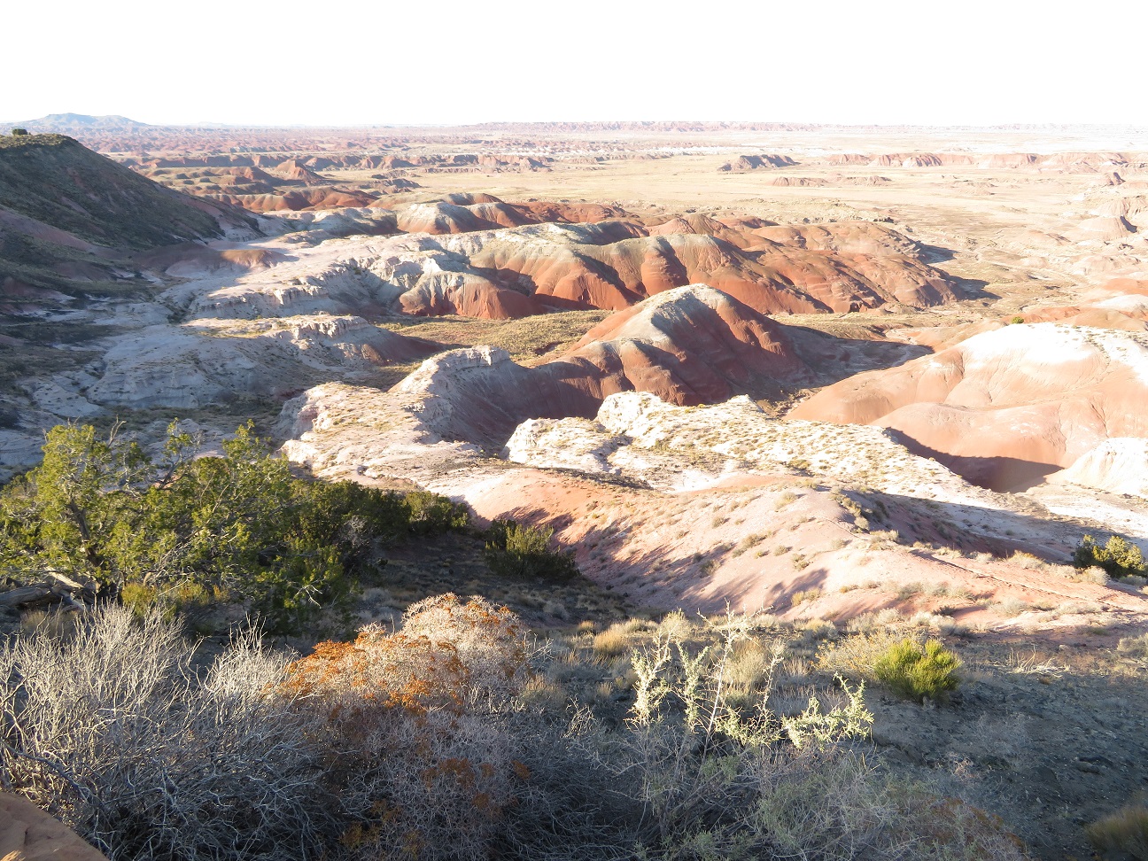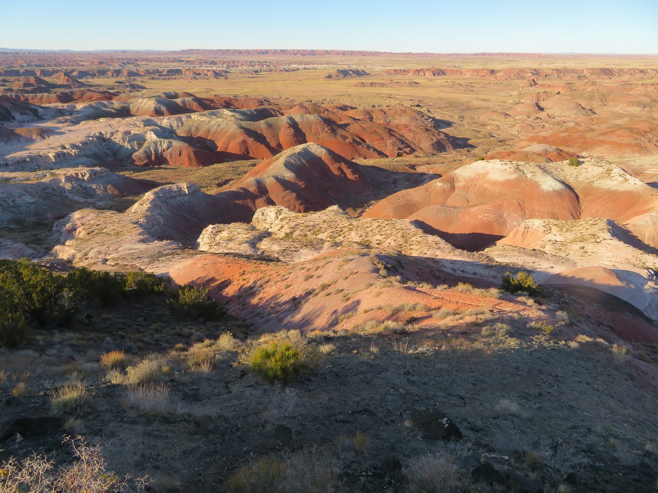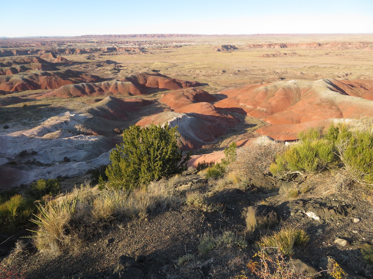 The Painted Desert is a land of many contrasts. Note the vegetation in the foreground, and the dearth of anything living in the background: