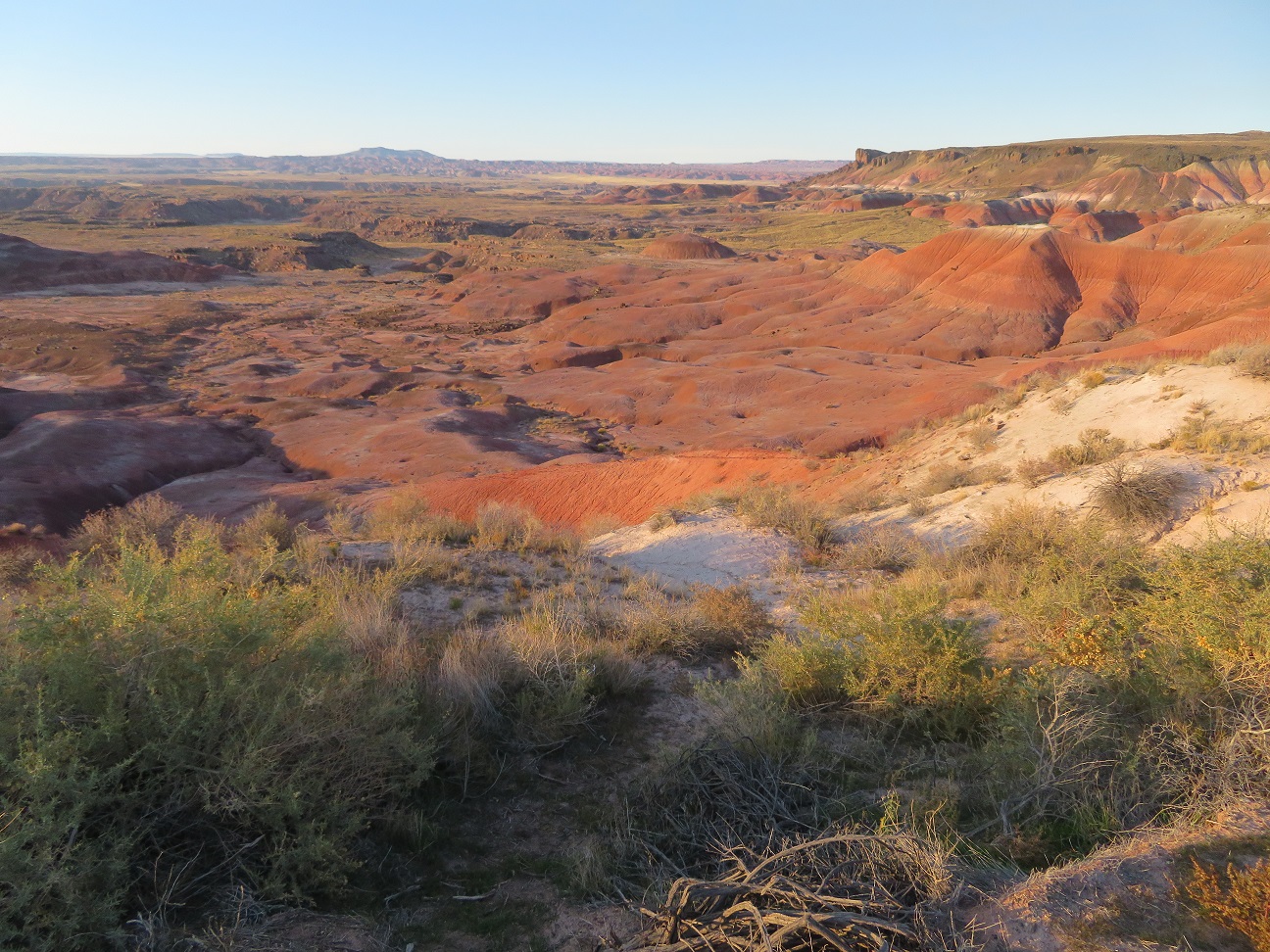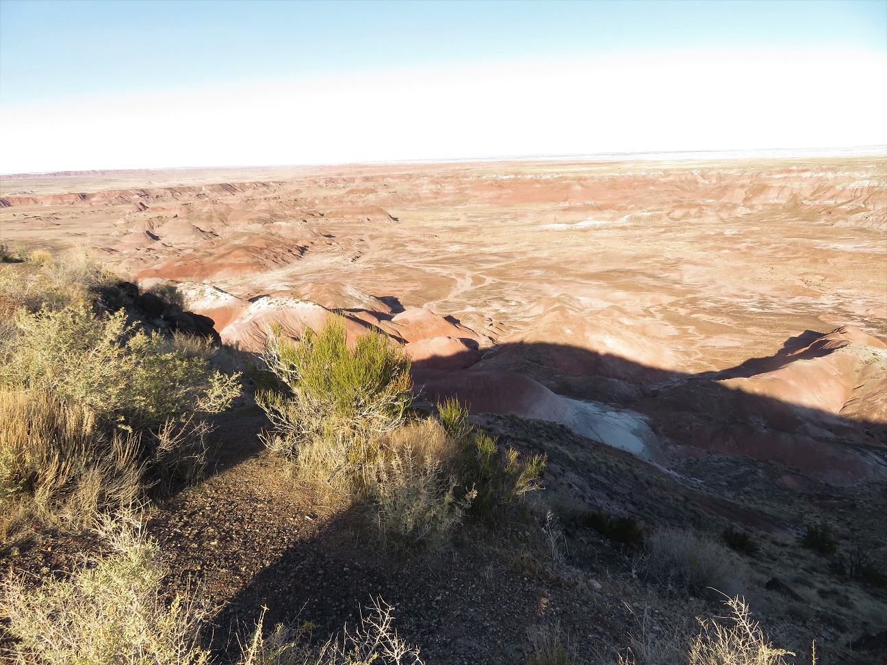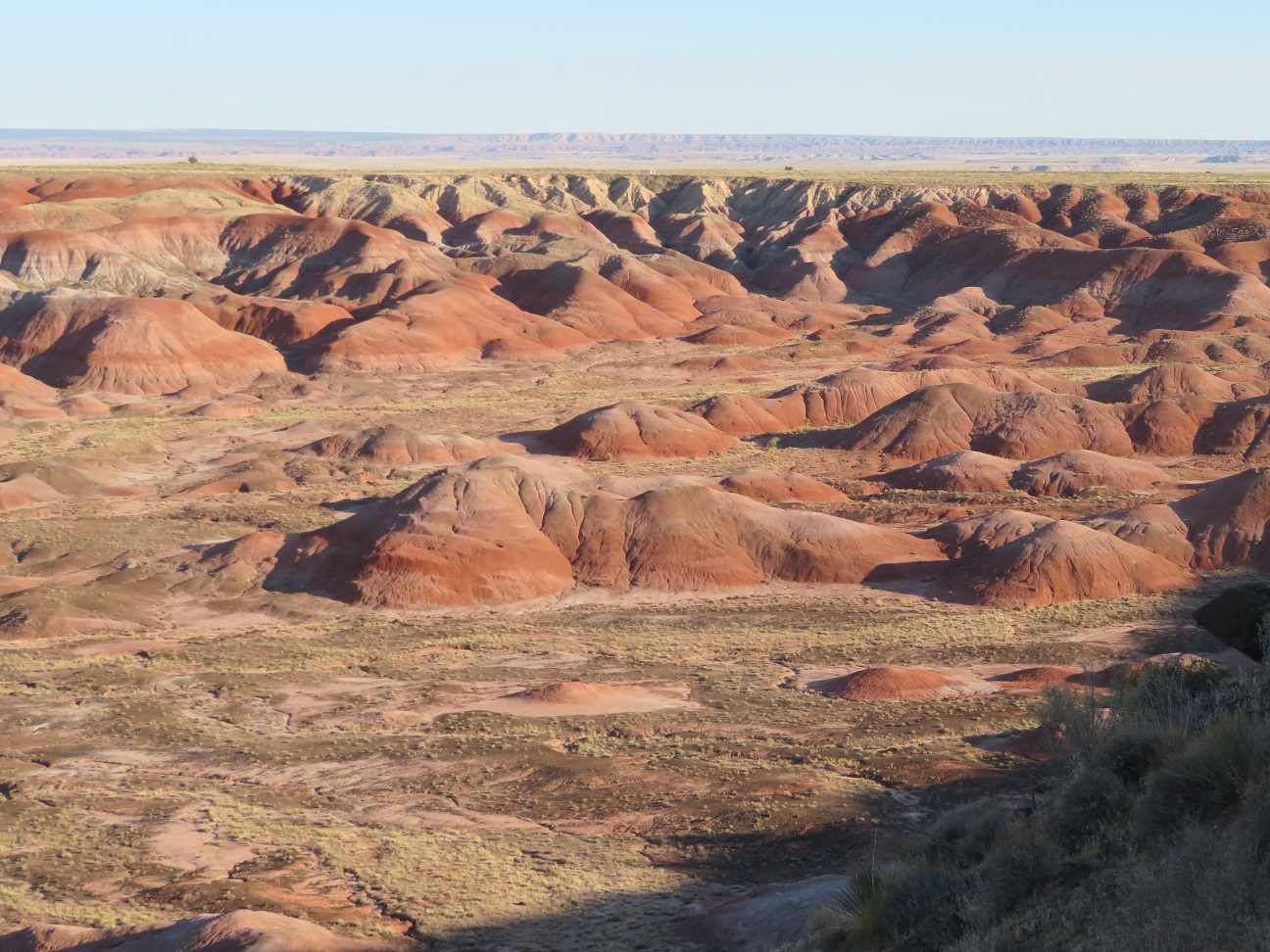 The Painted Desert is a land of many contrasts. Note the vegetation in the foreground, and the dearth of anything living in the background: