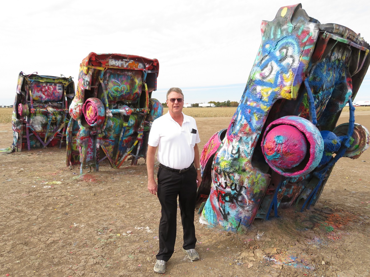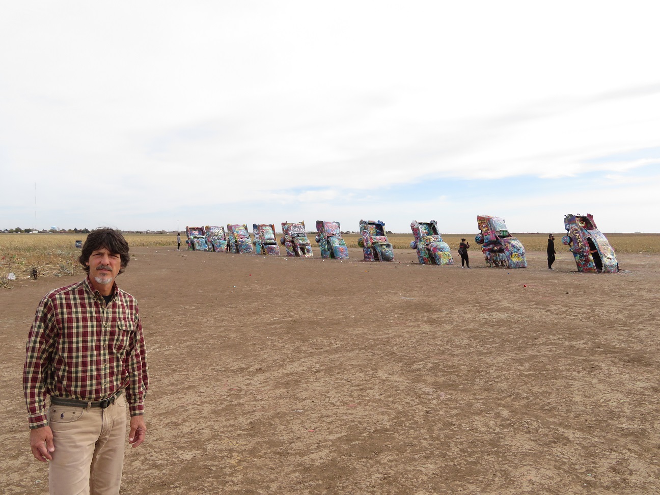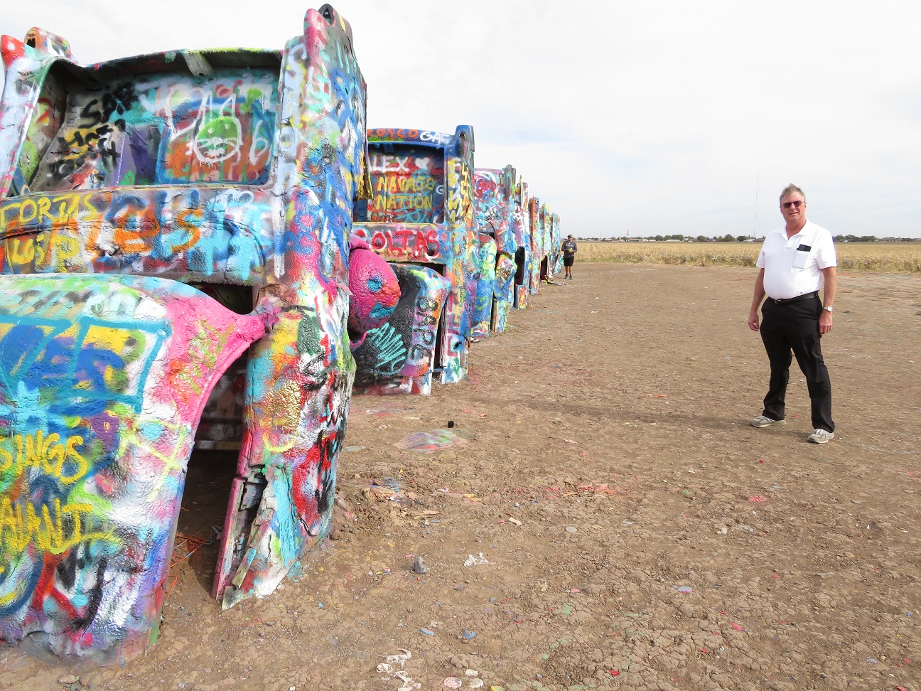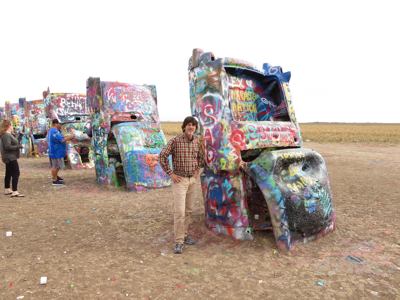Our first stop today was a visit to Cadillac Ranch in Amarillo, TX. It's really a crazy sculpture. Ten Cadillacs are buried nose-down in a field at the same angle as the Cheops Pyramid. The cars span the successive generations of the car line up to 1974 when the sculpture was created. You can see evolution of their tailfins. Weird, but interesting. There's a vendor selling spray paint, and people love to spray all kinds of things on the cars. The spray paint is now so thick that the metal underneath must be well preserved!