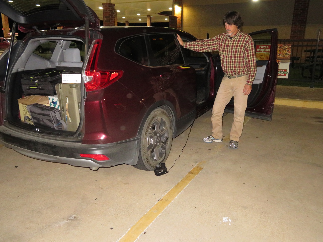 Between Amarillo and Wichita Falls, we got an alert that the tire needed air. That's the first time since Seattle that the tire needed air, so the leak is really slow. Andy aired it up with a portable compressor he bought. You can see by looking at the tires how dirty the car is from when we started!