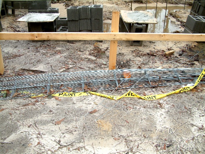 As they build the chain wall, the masons put these metal frames between every other course of cinder block for extra strength.