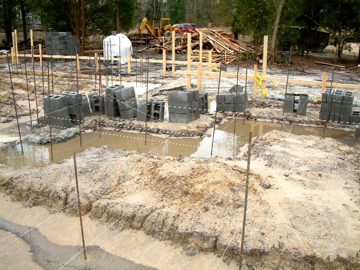 We've had many rain delays. Here the rain puddles around the footers.