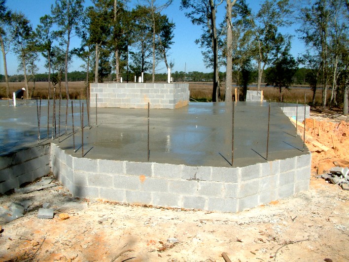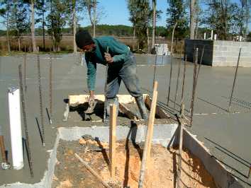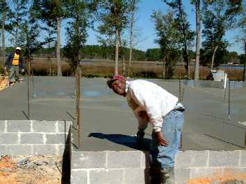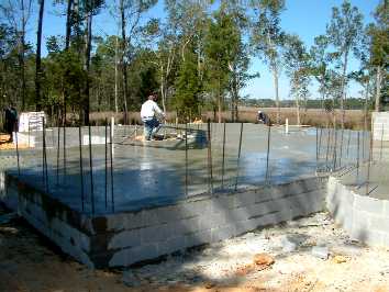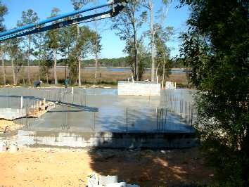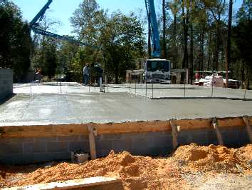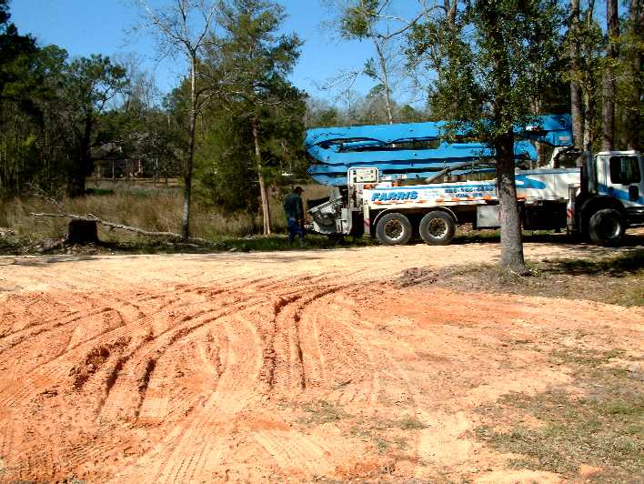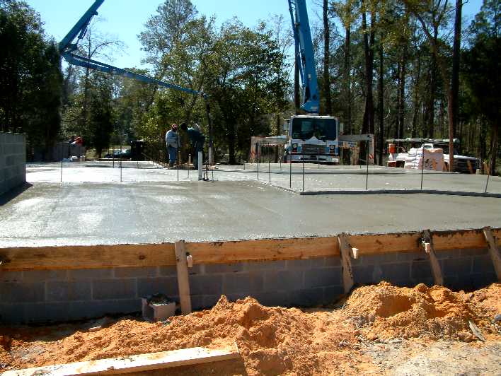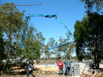 The slab has just been poured! You can see the concrete pump truck in the backgound. That's Ronnie Bogard, the builder, in the red jacket.