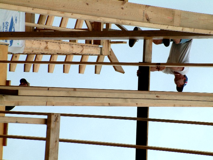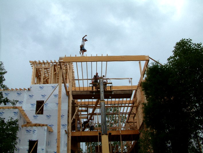 Stephen Delaney, a member of the framing crew, shows no fear.