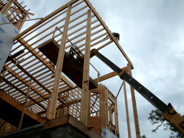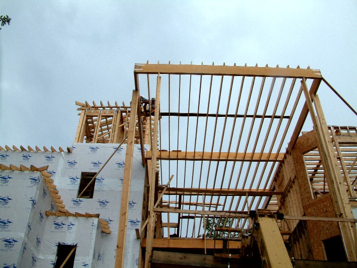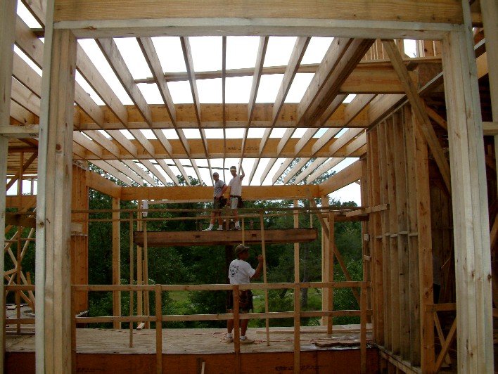 Here Stephen and Guy set walking boards on the front porch ceiling joists.