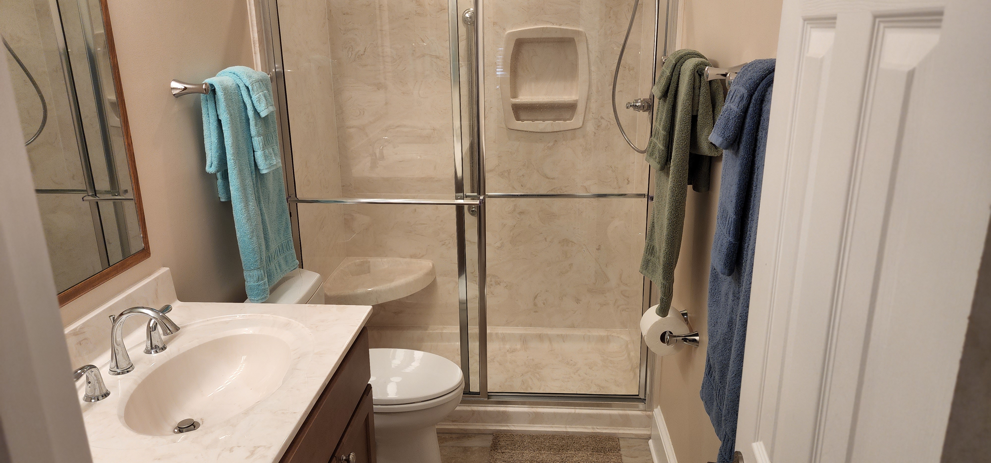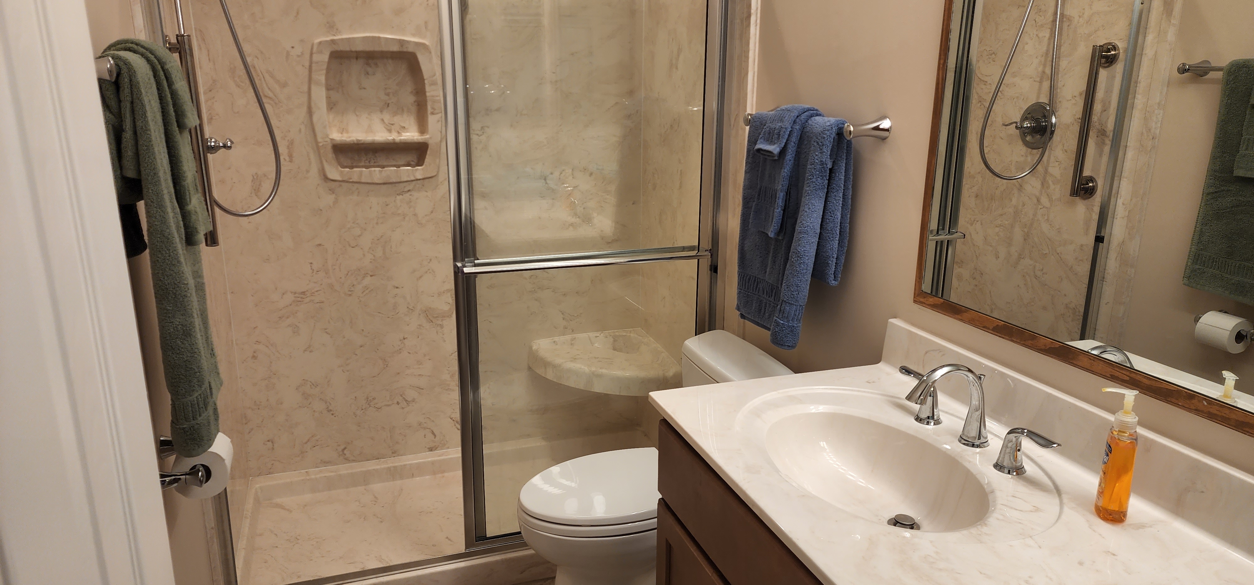 The bathroom is nicely appointed and includes a large walk-in shower with a seat: