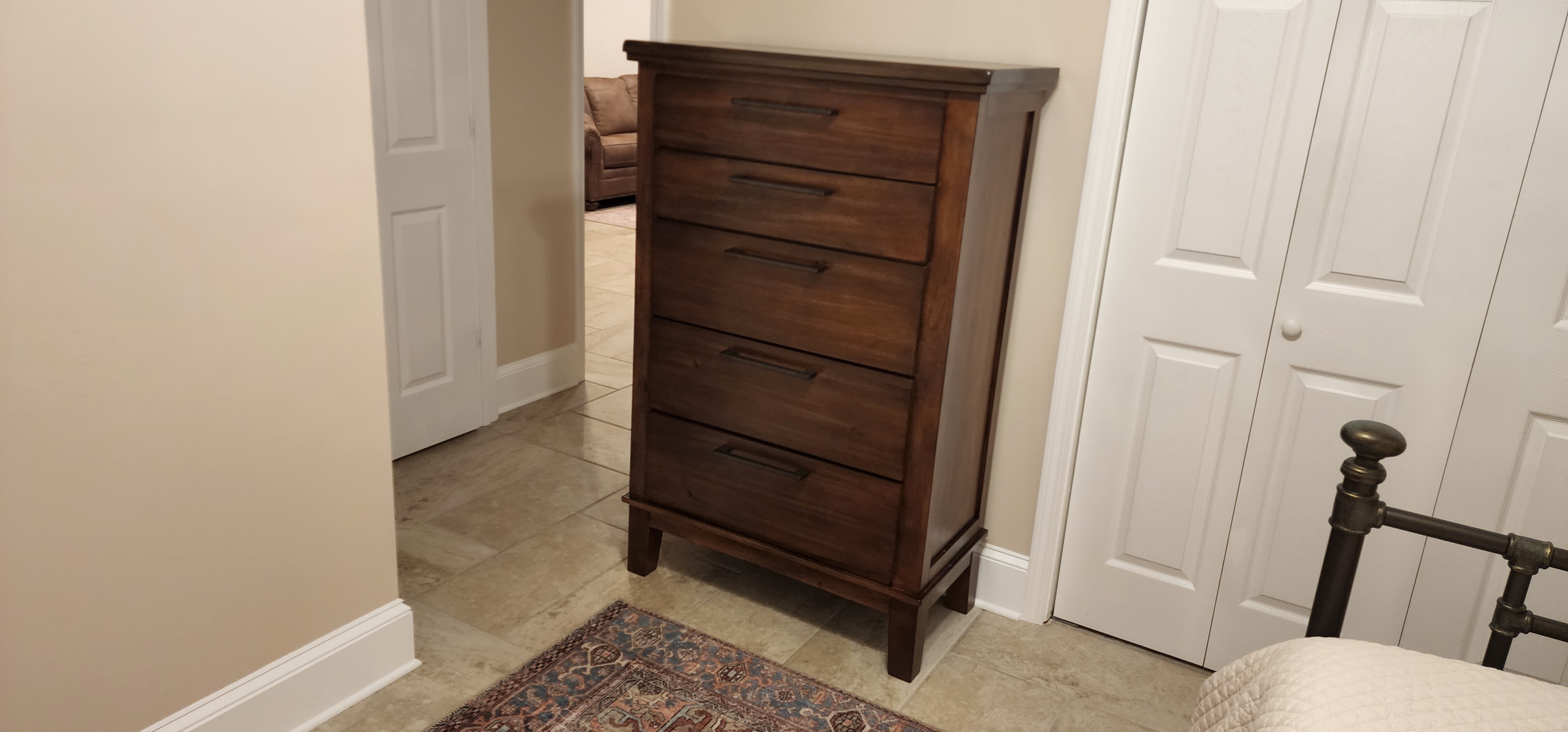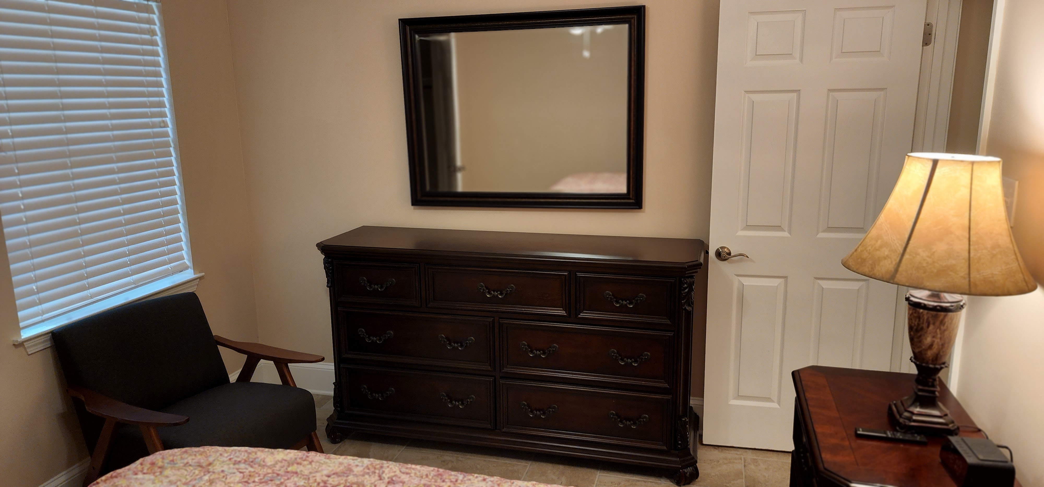 The master bedroom also has a television that extends, tilts, and swivels. It also has a comfortable chair and a large dresser: