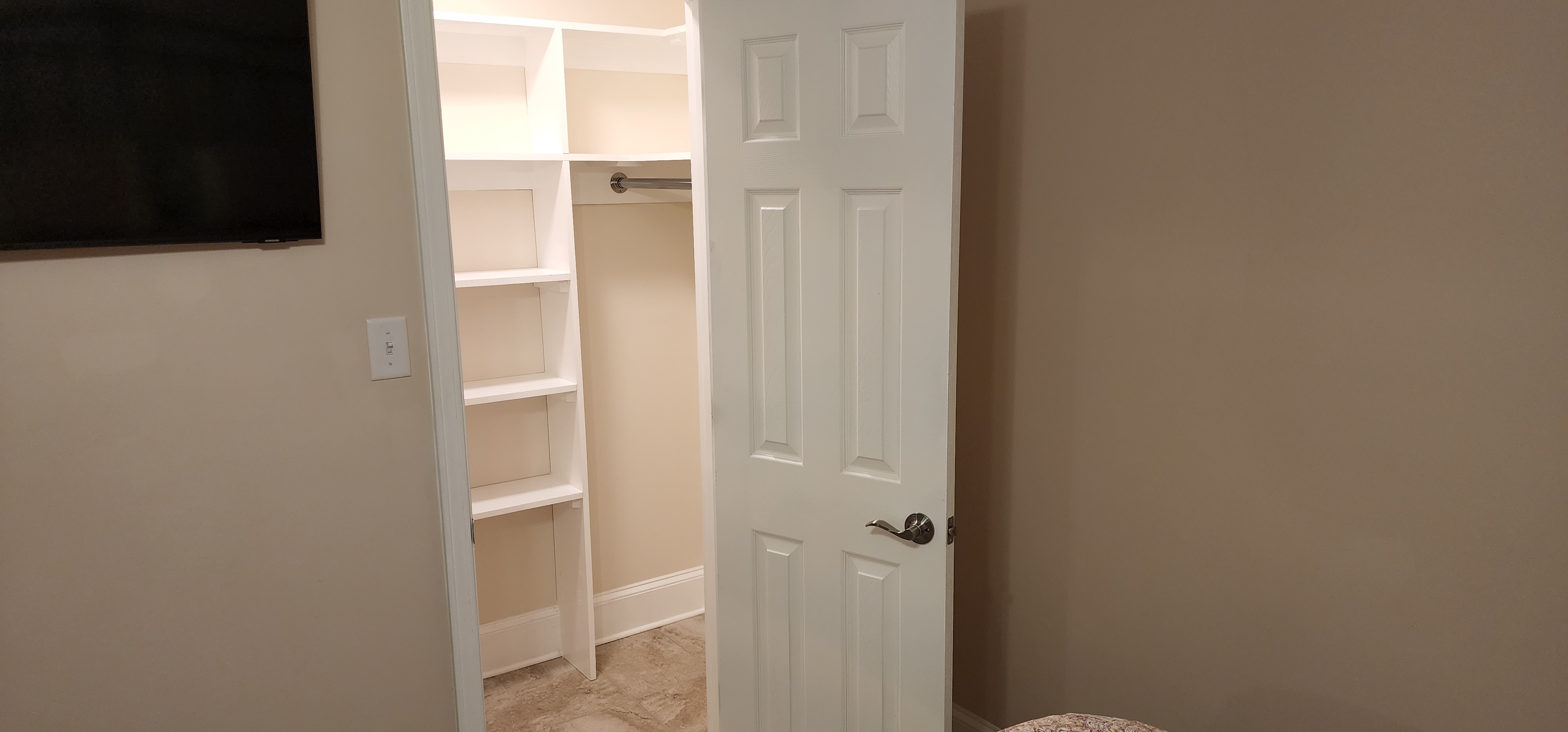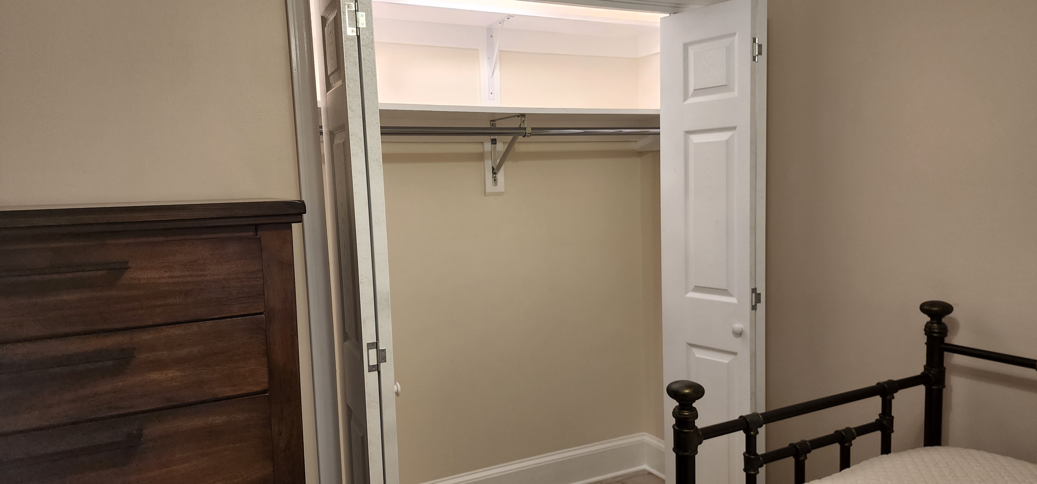 The master bedroom closet has two hanging poles and sturdy built in shelves: